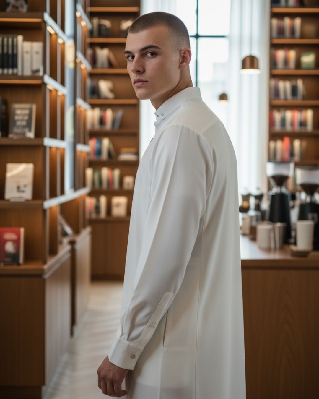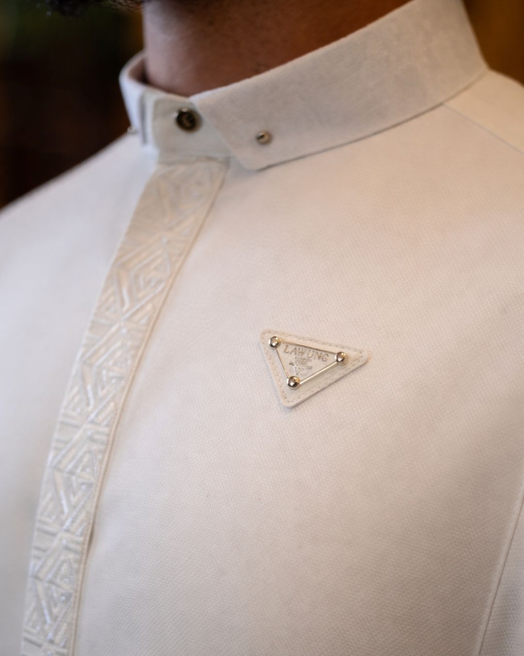 Lawung AAR2665 é um thobe árabe branco em tecido texturado premium com corte ajustado, gola estruturada e pala bordada que realça elegância e conforto.
