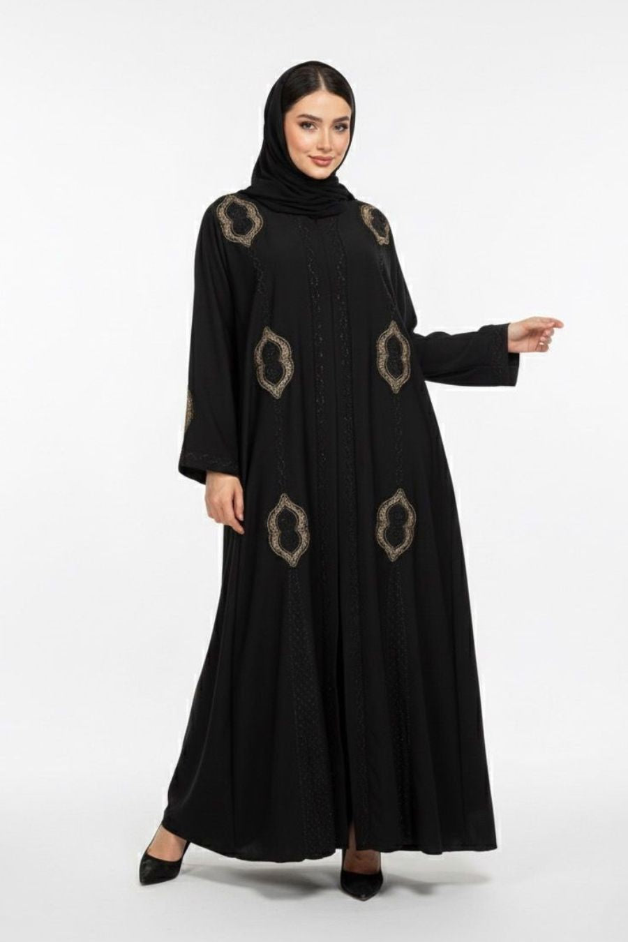 Abaya simples de cor preta com detalhes em pedrinhas.