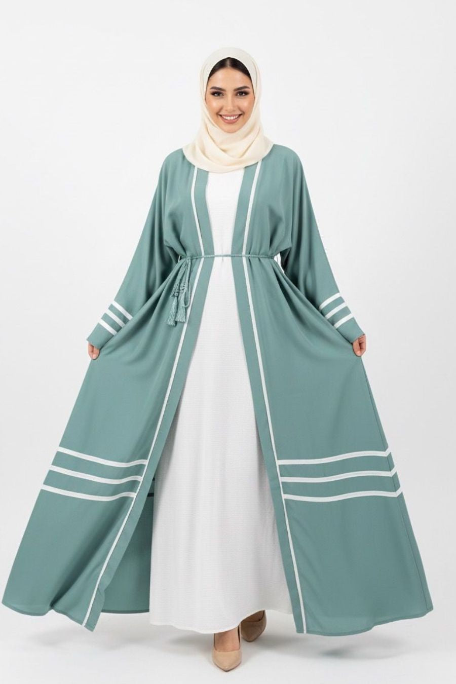Abaya de duas peças, a capa é de cor verde menta com riscas brancas em detalhe e o inner é de cor branca.