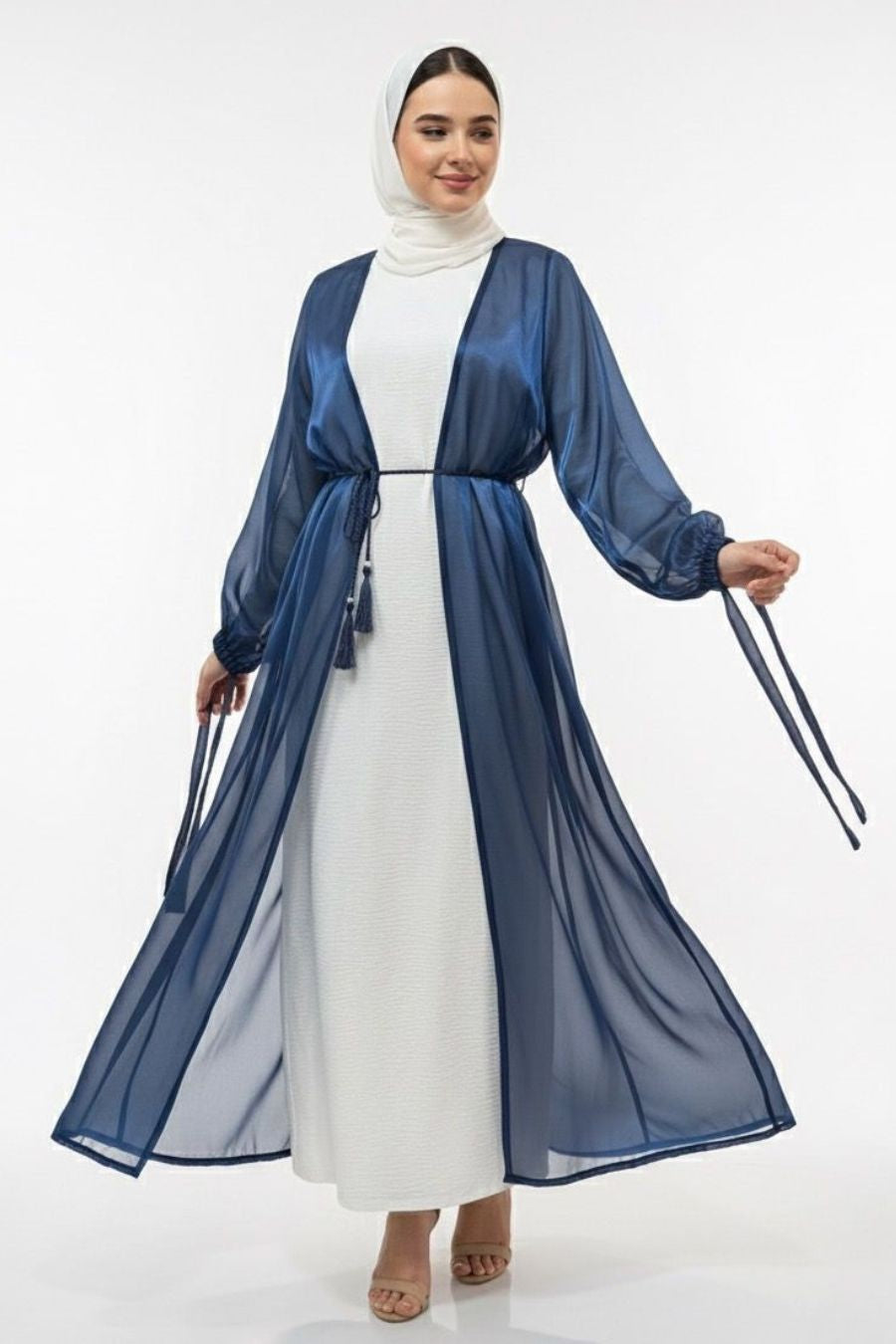 Abaya de capa azul navy transparente com detalhes na manga e inner branco simples.