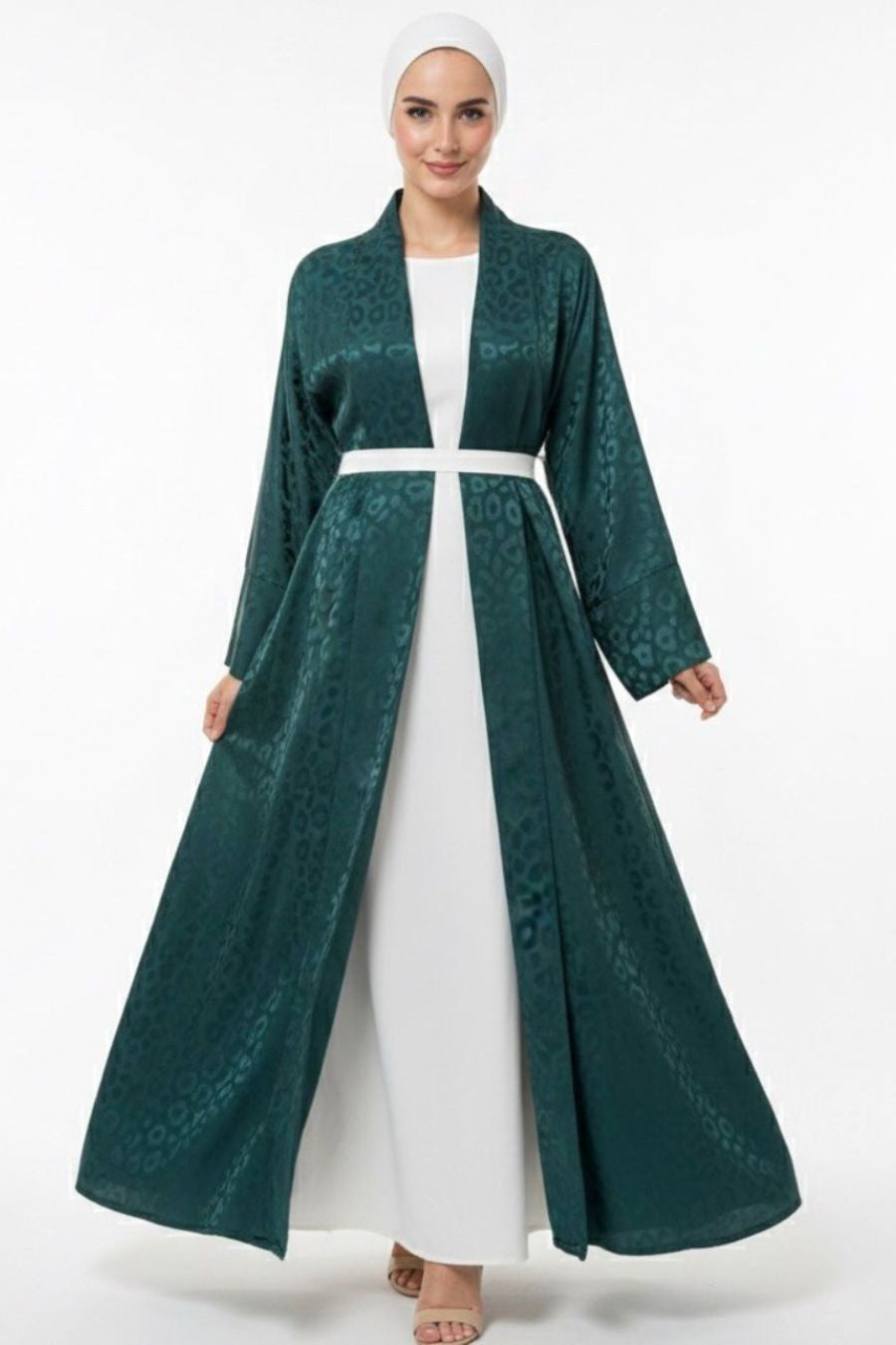 Abaya de duas peças, com capa verde turquesa com padrões como detalhes e inner branco de cetim.