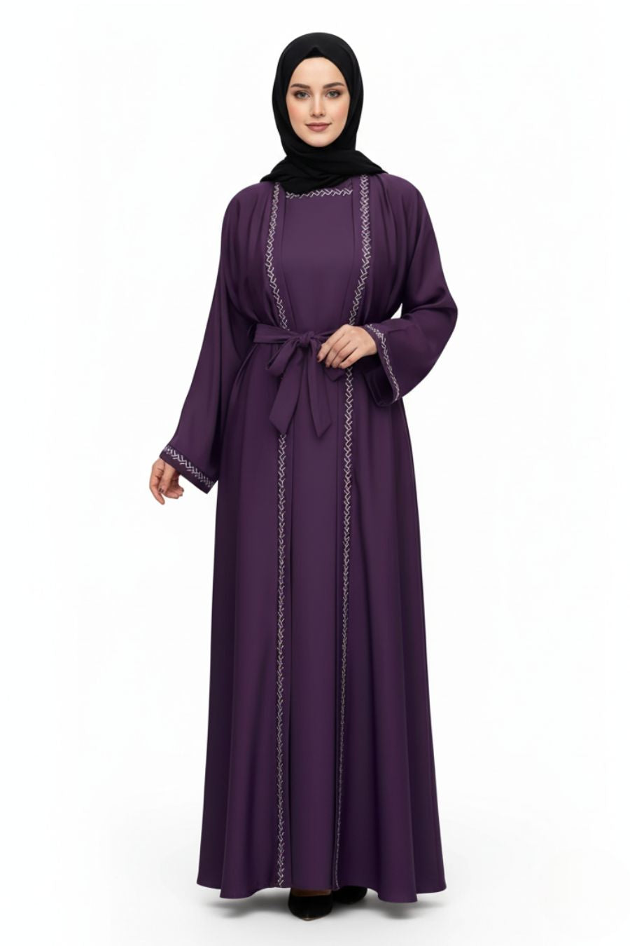 Abaya roxa de duas peças, com detalhes em bordado na capa.