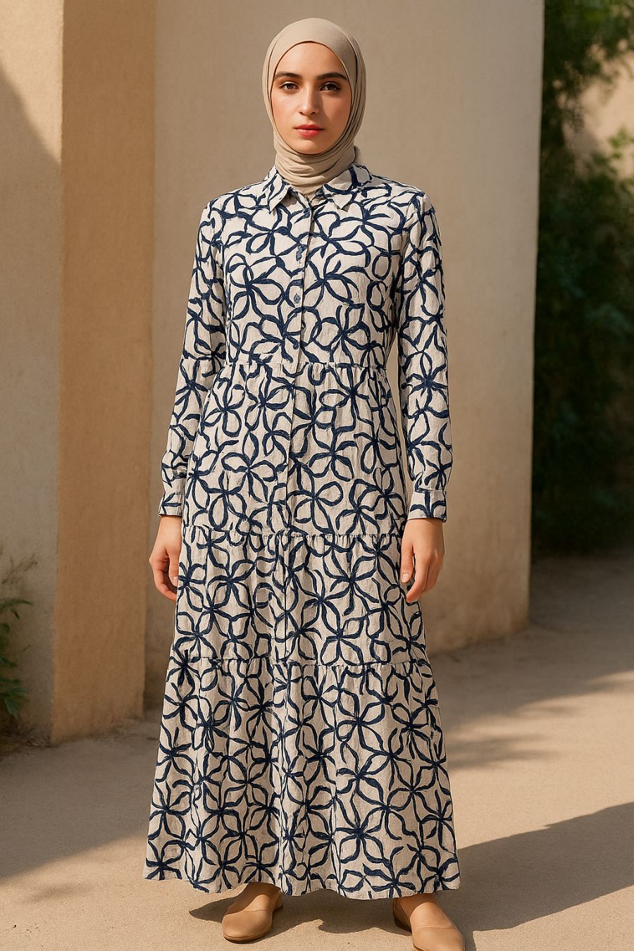 Vestido camisa casual modesto com estampagem em preto e branco.