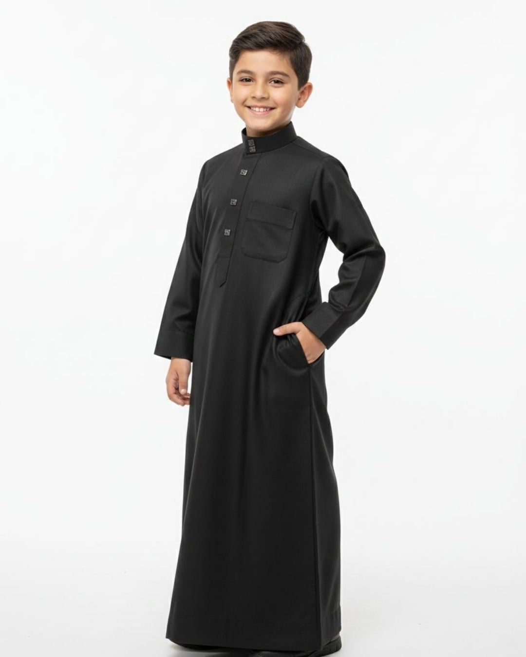 Jubo de criança de cor preta com tecido de algodão e detalhes em metal.