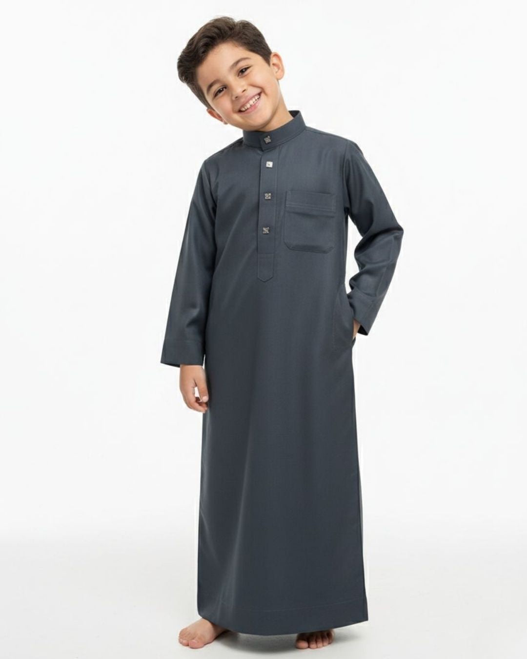 Jubo de criança de cor cinzenta com tecido de algodão e butões em metal.