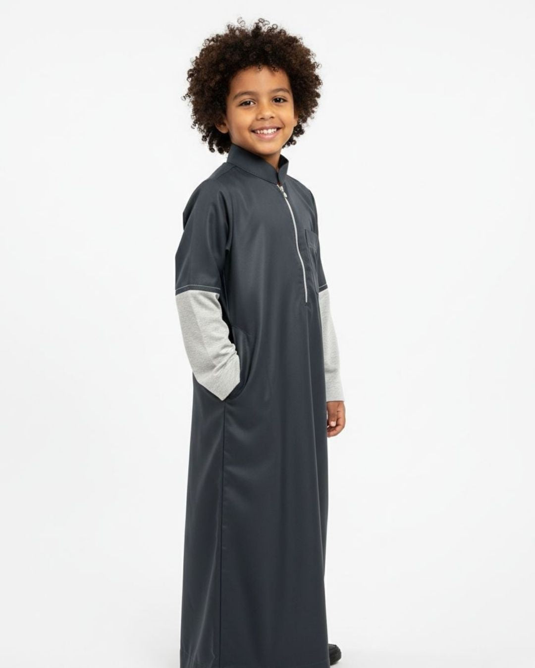 Jubo de criança de cor cinzento escuro com tecido de algodão e gola chinesa.