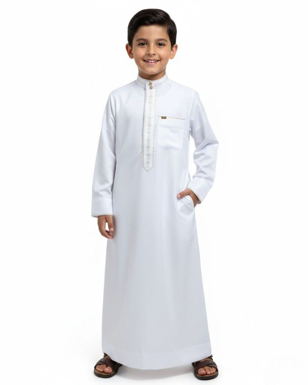 Jubo de criança de cor branca com tecido brilhante de polyester.