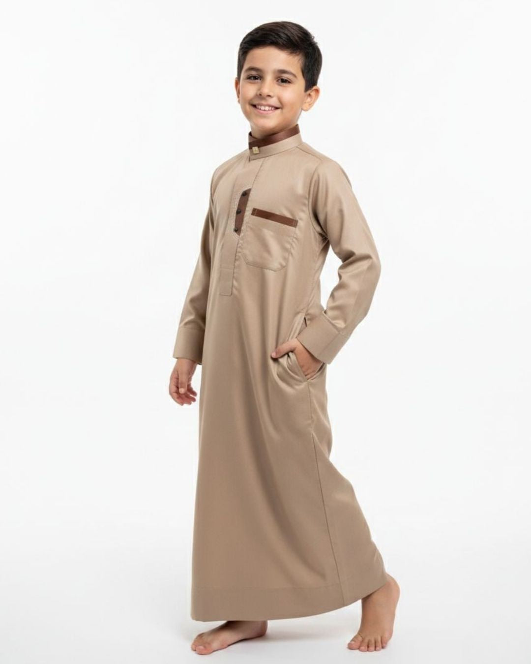 Jubo de criança de cor beige com tecido brilhante de polyester.