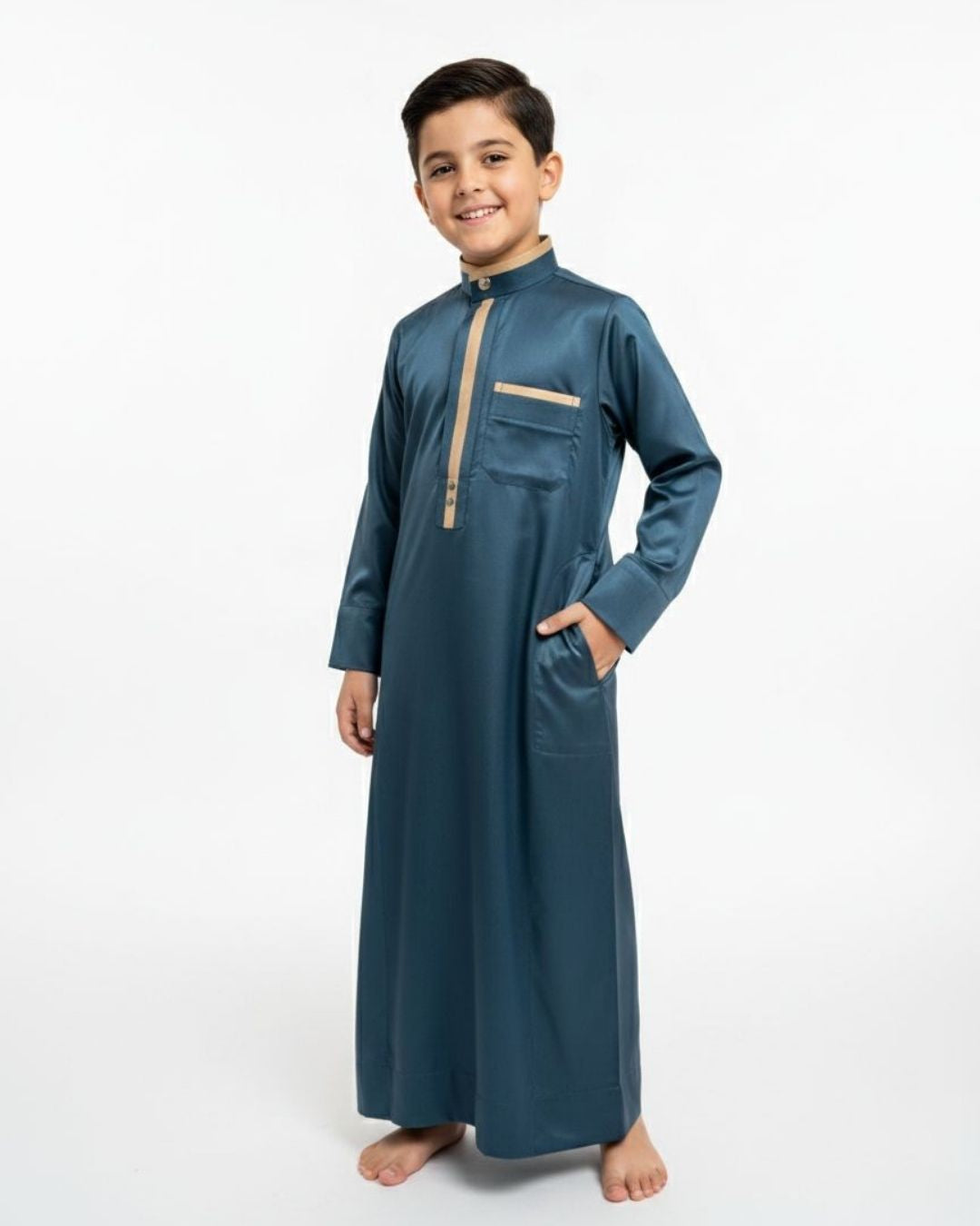 Jubo de criança de cor turquesa com tecido brilhante de polyester.