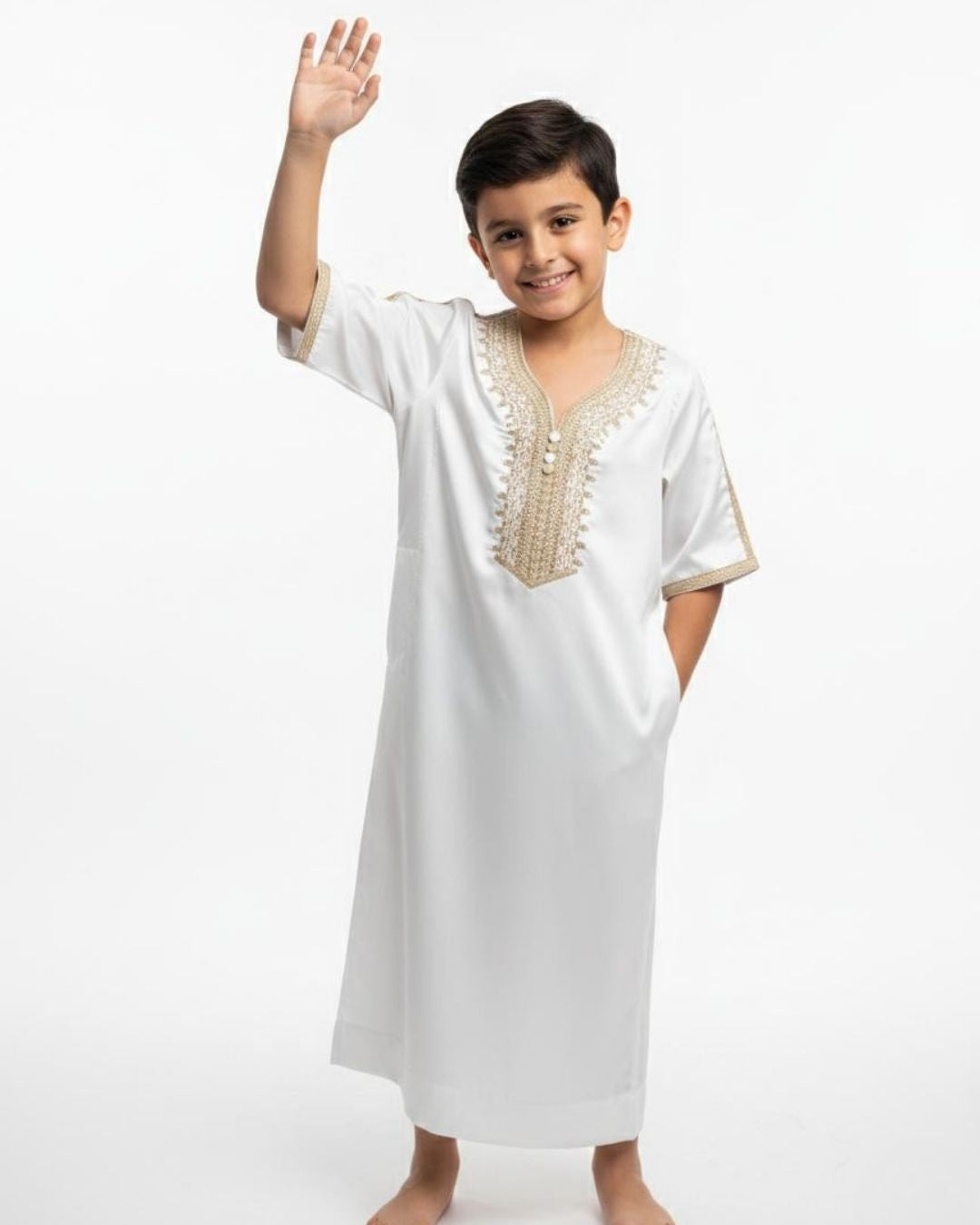 Jubo de criança marroquino de cor branca com tecido brilhante de polyester.