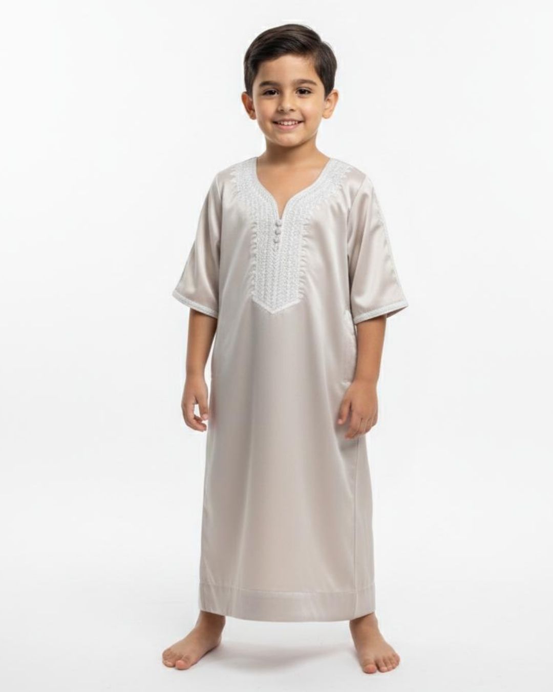 Jubo de criança marroquino de cor creme com tecido brilhante de polyester.